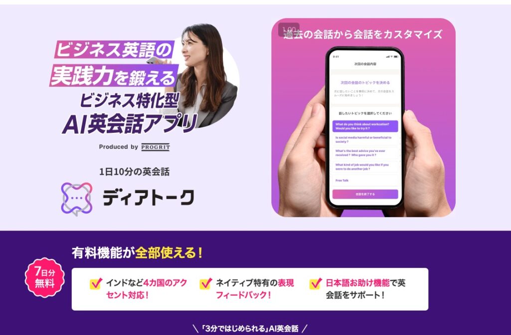 ビジネスシーンを想定した会話や、日常のちょっとしたトピックまで幅広く対応していて、日本語で質問できるヘルプ機能もあるので、英語に自信がない方でも安心して使えます。