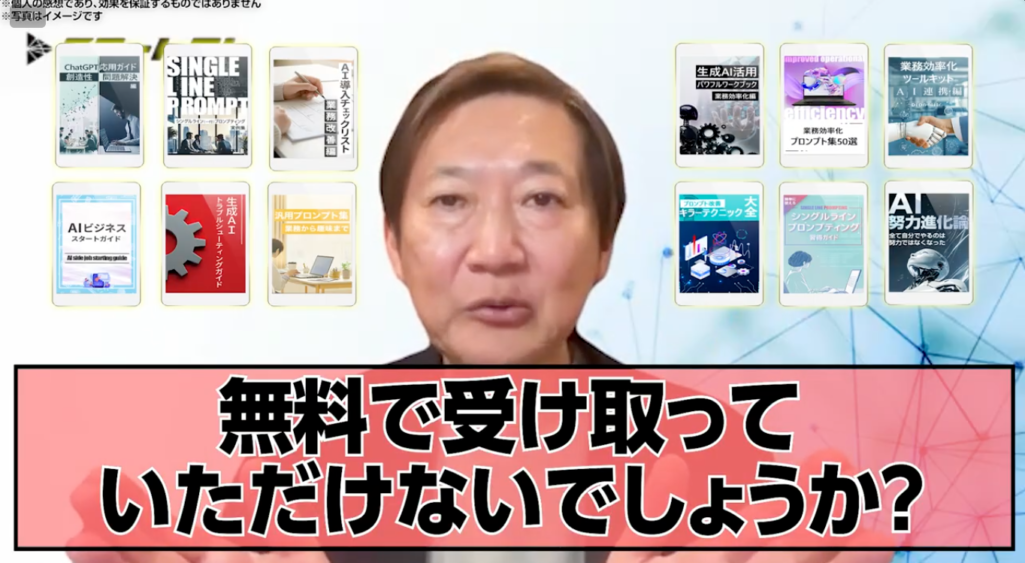 確かに、これは視聴者を最後まで引きつけるための「撒き餌」です。しかし、その中身(プロンプト集や電子書籍など)は、普通に販売すれば数千円〜数万円の価値があるクオリティでした。