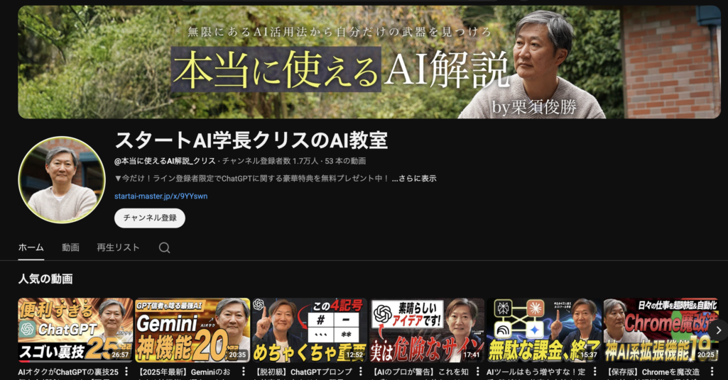 そこで、栗須俊勝氏が運営する公式チャンネル「スタートAI学長クリスのAI教室」(ハンドル名:@本当に使えるAI解説_クリス)を、プロの視点で徹底解剖しました。