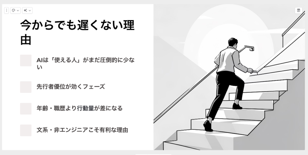 副業から始めて独立を視野に入れるような本格的なキャリアプランまで、AIを武器にして経済的な成功を掴み取るためのロードマップが示されています。