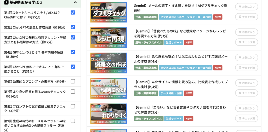 スタートAIでは、難しい理論やプログラミングを学ぶのではなく、「成功している型(レシピ)」をそのまま真似して、同じ成果物を作るというレシピスタイルが徹底されています。