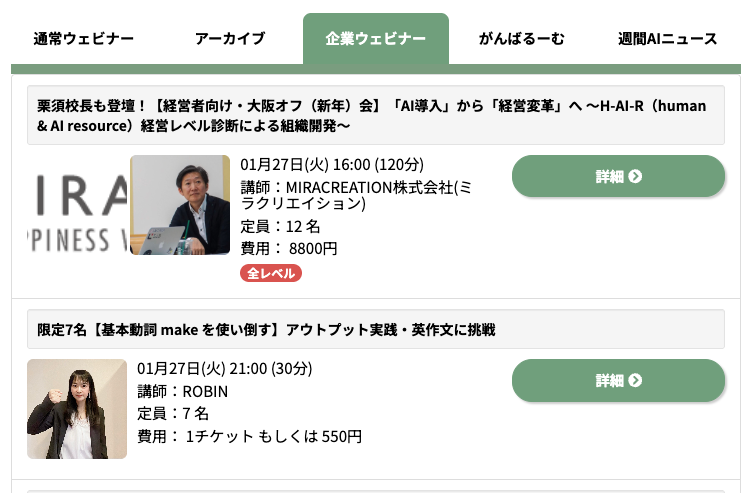 | 学べるAI | ChatGPT、Midjourney、Felo、Canva、Vidnoz、Perplexity、Genspark、Ganma、NotebookLM、Vrew、DreamStudio、Perplexity、HeyGen、Glarity、Runway、LUMA AIなど |