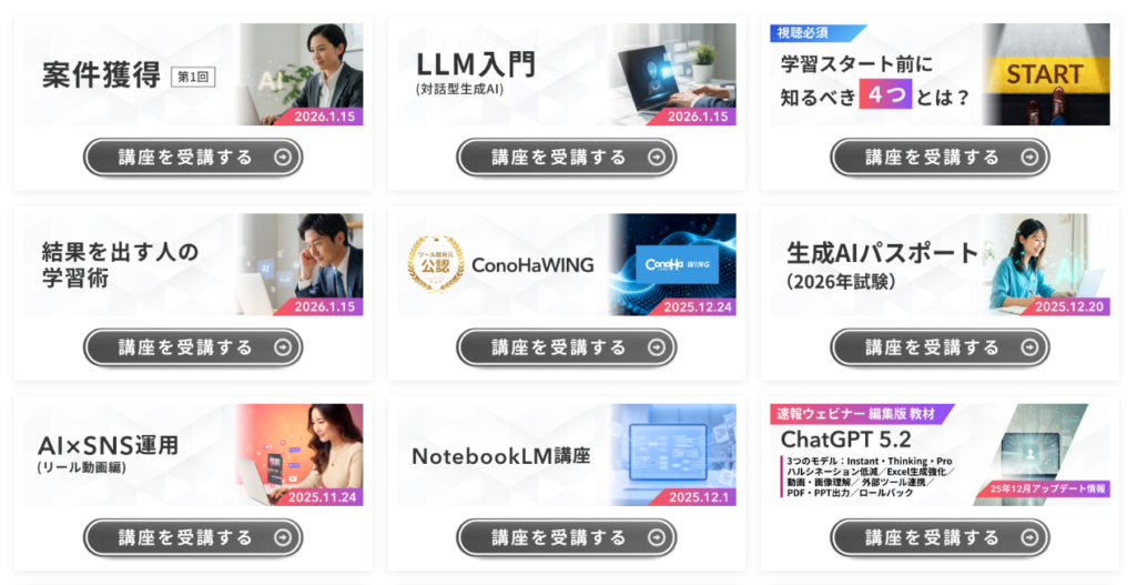 - 生成AIを基本から応用まで体系的に学べる