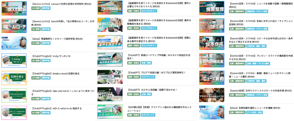 内容は実践的で満足していますが 初心者向けの説明が多いため ある程度AIを使っている人には少し物足りなく感じる部分もあるかもしれません また情報量が多いので 自分で復習する時間を取らないと理解が浅くなると感じました 忙しい時期だと動画を消化するペース管理がやや大変でした