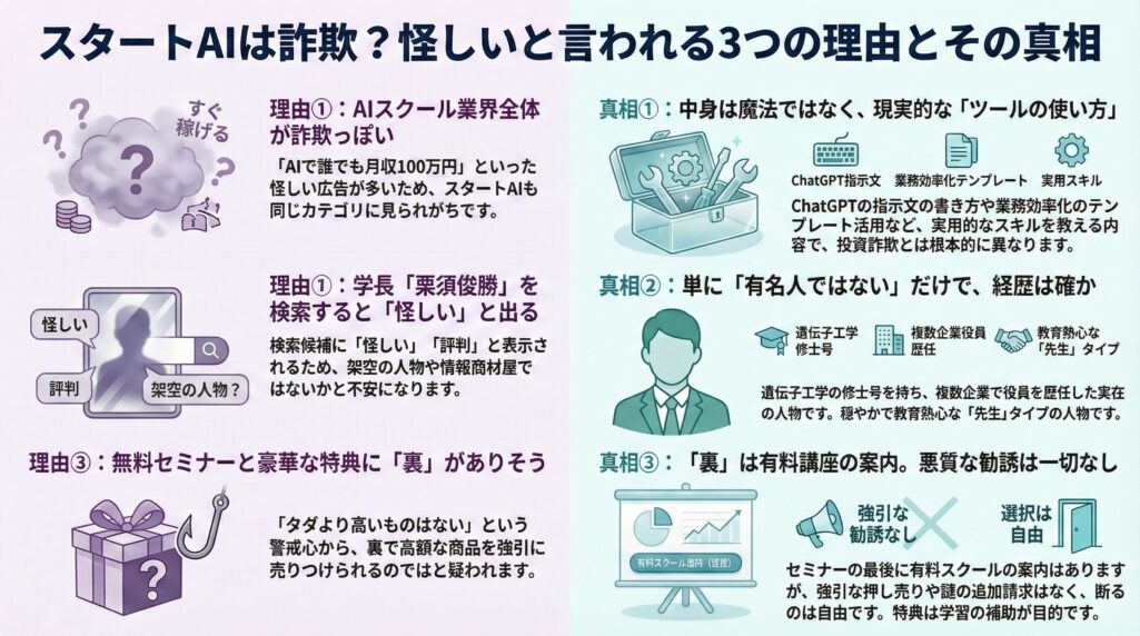 結論から言うと、スタートAIは詐欺ではなく、未経験者がゼロからAI活用を習得できる優良スクールです。