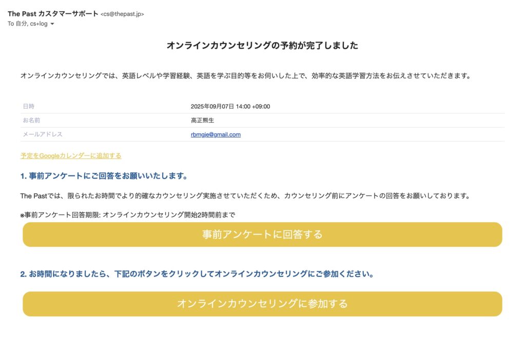 メールが届くので、そこに記載のリンクから事前アンケートに回答します。当日になったら「オンラインカウンセリングに参加する」のリンクをクリックしてZoomによるオンラインカウンセリングに参加します。