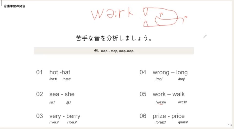 私の場合、workの発音に改善が必要とのことで、一緒に練習をしてくれました。